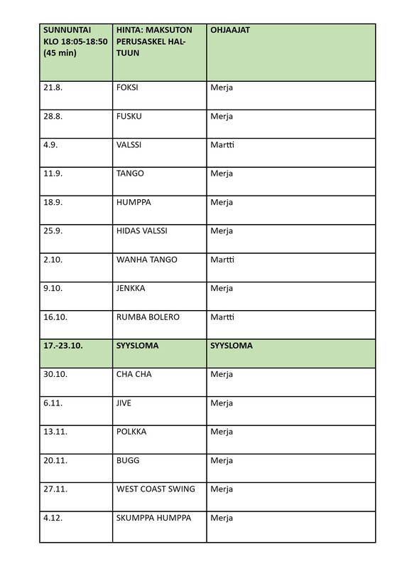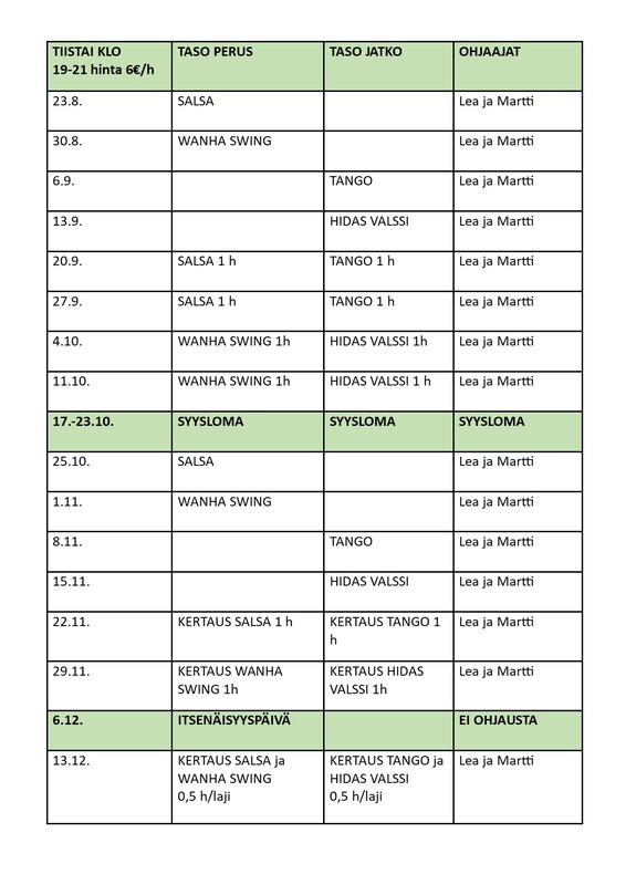 Ohessa syksy 2022 viikko-ohjelma sekä lavatanssituntien sisällöt ohjaaja tietoineen. https://www.casamba.fi/lukujarjestys-ja-salivaraukset/ Casamban toiminnassa uusina ohjaajina aloittavat Alice Seppänen ja Vilma Karvonen Tanssikirppu ryhmän vetäjinä. Satu Roininen vetämänä aloittaa vanhempi/lapsi ryhmä, joka kokoontuu keskiviikkoisin klo 16-17. Tanssillista liikettä vanhempi yhdessä lapsen kanssa, 2 v + Vakio- ja latinalaistanssien alkeet 10 v + ryhmää tulee vetämään Henrik Toivonen, B-A luokassa kisaillut nuorimies. Toivotamme uudet ohjaajamme tervetulleiksi Casamballe ! Tankotanssiryhmiin ja Heli Vännisen vetämiin torstain ryhmiin aukeaa Myclub ilmoittautuminen 2.8. Paikat kannattaa varata ajoissa. https://casamba.myclub.fi/flow/events/public Uutena soolorymänä aikuisille alkaa Seminaarin koululla torstaisin vakio- ja lattarit helpoin kuvioin klo 19:30-20:30 Juha Maskosen vetämänä. Torstaisin Heli Vännisen vetämiin ryhmiin tulee uusia ryhmiä ja aikataulu muutoksia entisiin. Luova tanssi/erityistanssi klo 16-17 (uusi) Helin vetämänä https://www.casamba.fi/soolotanssiryhmat/luova-tanssi-erityistanssi/ Latin Show nuoret 10 v + klo 18-19 (uusi) Heli Vakio- ja latinalaistanssin tekniikka tunti kaikille, myös lapsille ja nuorille klo 17-18 Heli Tuntia suositellaan kaikille, jotka haluavat hioa tanssinsa tekniikkaa joko pareina tai soolona , suositellaan myös edistyneille soolo- ja lavatanssijoille. Latin Show Synchro, aikuisille ihanat lattari koreografiat, jatkaa edelleen. Huom ! muuttunut klo aika klo 19-20 Heli Kansantanssit alkavat sunnuntaina 4.9., joka on myös maksuton kokeilukerta.Lavalyhytkursseja tulossa lauantaisin klo 13-15 24.9. lajit bugg ja rumba bolero 1.10. lisätietoja myöhemin. 29.10. fusku ja cha cha