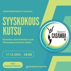Tanssiurheiluseura Kajaanin Casamba ry syyskokous järjestetään ti 17.12. klo 18 Syväojankatu 3 kahviotiloissa. Tilaisuus on avoin, osallistuminen ei vaadi tulla valituksi mihinkään toimeen seurassa. Kokoukseen voi tulla kuuleemaan suunnitelmista ja kuulemaan henkilövalinnoista joutumatta itse tulla valituksi. Tilaisuudessa on tarjoilua. Tervetuloa ! Seuran toimintaa ja taloutta hoitaa johtokunta, johon kuuluu toimintavuodeksi valittu puheenjohtaja, ja toimintavuodeksi valitut 4-8 jäsentä Johtokunta valitsee keskuudestaan varapuheenjohtajan. Johtokunta valitsee lisäksi sihteerin, taloudenhoitajan ja muut tarvittavat toimihenkilöt, jotka voidaan valita myös johtokunnan ulkopuolelta. Seuran sääntöjen mukaan seuralla on kaksi varsinaista kokousta vuodenkierrossa, joista toinen on syyskokous, jossa vahvistetaan mm. liittymis-, jäsen- ja kannatusjäsenmaksut , vahvistetaan tulevan vuoden toiminta- ja taloussuunnitelma, valitaan seuran puheenjohtaja ja johtokunnan jäsenet. Valitaan myös tulevan vuoden tilintarkastajat.