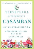 Tanssiurheiluseura Kajaanin Casamba Ry 40 vuotta v. 2025 Toimintamme 40 vuotisjuhlaa vietämme Keskuskoulun salissa su 4.5. klo 13-16 Väinämöisenkatu 28 Kajaani Luvassa on kunniavieraiden vastaanoton, juhlapuheiden ja muistamisten lisäksi tietenkin esityksiä. Ja eihän juhla ole mikään, jollei ”nisu” kahveja ole tarjolla. Lämpimästi tervetuloa juhlimaan kanssamme ! Tanssiurheiluseura Kajaanin Casamba Ry 40 vuotta tanssiliikuttajana Kajaanissa ja Kainuussa ! #40vuottacasamba #tanssi #tanssiliikuttaja #liikukajaanissa #kajaani #kainuu #tanssillaterveyttä #tanssillailoaelämään #tanssillaenergiaaelämään #tanssillakuntokohoaa |