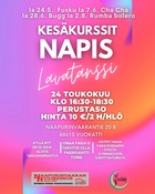 Naapurinvaaran huvikeskus, Napis kesätanssikurssit klo 16:30-18:30 Karaoke-baarissa Kurssit ovat kaikille kiinnostuneille, aiempaa osaamista ei tarvitse olla, liikkeelle lähdetään perusteista. a 24.5. Fusku Käynti rakennuksen takaosasta Karaokebaarin ovesta La 7.6.2025 Kesäkauden avaus: Heikki Koskelo & Tähti ja Sari Koivikko & Kuunhopea. Karaoke. Lippu 22 euroa. Tanssien lipunmyynti alkaa kello 19.00, ensimmäiset valssit soitetaan kello 19.30 ja viimeiset kello 00.30. Talo sulkeutuu kello 01.00. Vuoden 2025 ajan alle 25-vuotiaat tanssilippu alennettuun hintaan 11 euroa lipunmyynnistä. Ostettaessa esitettävä henkilöllisyystodistus. Opiskelijakortilla yhden euron alennus normaalista tanssilipusta. Yksi etu käytettävissä kerrallaan. Tervetuloa kurssille ja tanssimaan !