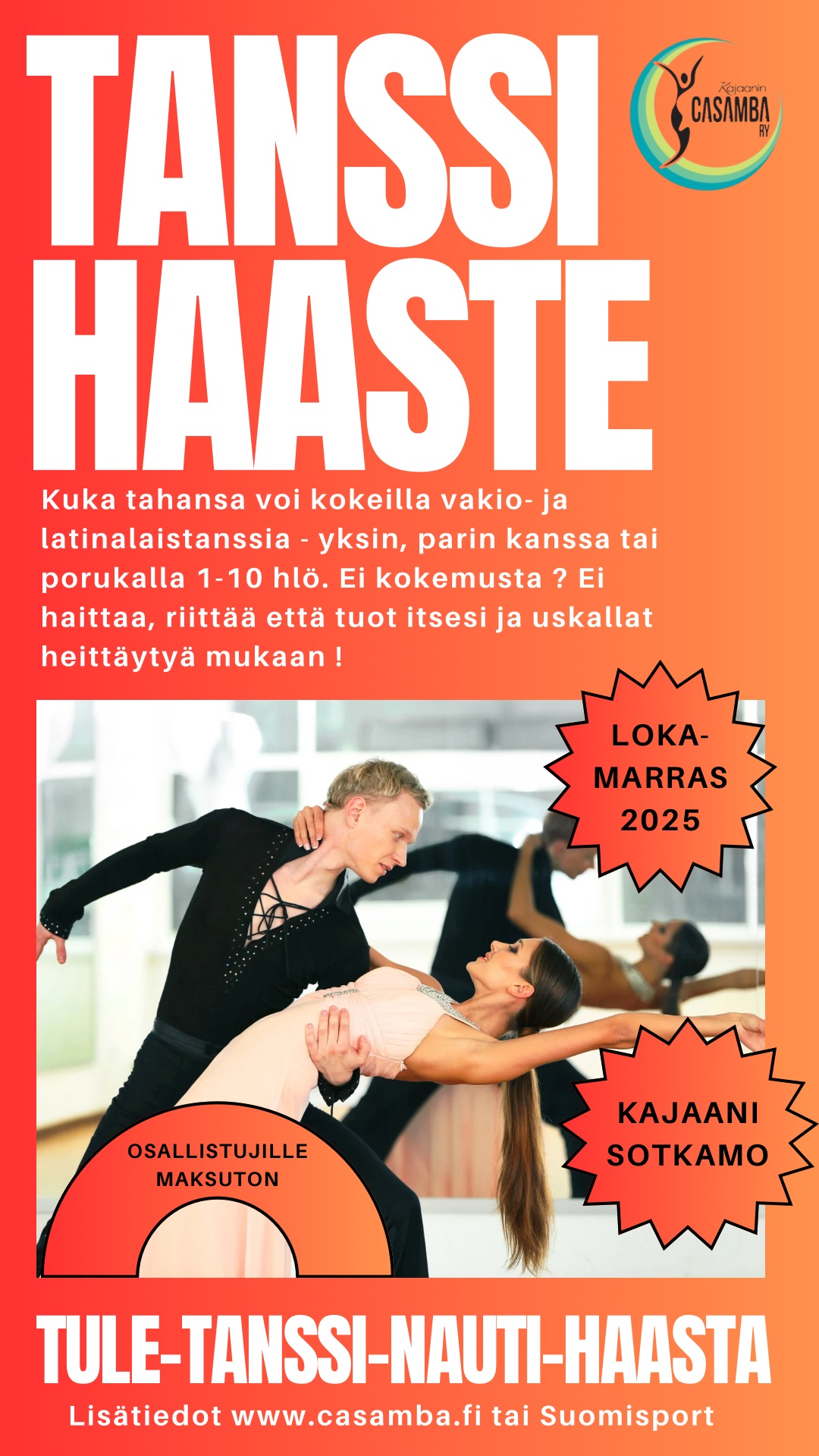 Tanssihaaste kaikille! Oletko aina halunnut kokeilla Tanssii Tähtiin ohjelman lajeja, vakio- ja latinalaistansseja ? Nyt se on mahdollista ja vieläpä täysin maksutta ! Ei kokemusta ? Ei haittaa, riittää että tuot itsesi ja uskallat heittäytyä mukaan ! Kuka tahansa voi kokeilla vakio- ja latinalaistanssia - yksin, parin kanssa tai porukalla 1-10 hlö. Harjoitukset alkavat lokakuun alusta ja kesto on loka- marraskuu. Kokoontumisia on yhteensä 8 kertaa. Kajaanissa Seminaarin koulun salissa su 5.10. klo 17-18 Opettajat Juha ja Tarja Maskonen. Sotkamossa vko 41 asti ke 18-19 Leivolan koulun sali, vko 42 on syysloma, vko 43 lähtien torstaisin 18.30-19.30 Salmelan koulun sali Opettajat Jari Kettunen ja Anna Heikkinen Lue lisää Suomisport, www.casamba.fi tai biossa löytyvästä linkistä ja heittäydy mukaan ! Tervetuloa mukaan ! Lue lisää ja ilmoittaudu mukaan ! Kajaani