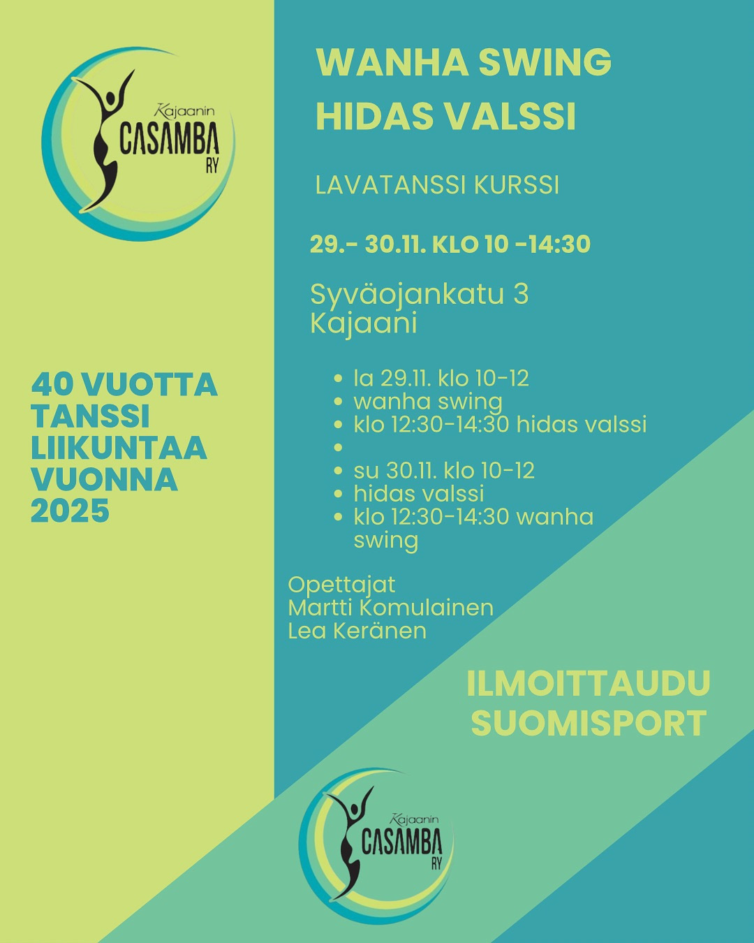 Wanha Swing ja hidas valssi kurssi 29.-30.11. La klo 10-12 wanha swing ja klo 12:30-14:30 hidas valssi Molemmat lajit perusteista liikkeelle ja jatketaan ryhmän mukaan Opettajat Martti Komulainen ja Lea Keränen Seuran jäsenille Early bird hinta 26.11. klo 23:59 saakka koko kurssi (8 h ) 80 € Ilmoittautumiset ja lisätiedot Suomisport, linkki löytyy myös biossa sekä www.casamba.fi Maksut julkaistaan osallistujille ilmoittautumisten mukaan pe 28.11. aikana ja kurssimaksut tulee olla maksettuna kurssille saapuessa. Suomisport palvelussa ovat valittavana verkkopankkimaksu, korttimaksu Visa, Visa Electron ja MasterCard, MobilePay, Pivo, Siirto, Svea Erämaksu ja Svea lasku (+5 €) Liikuntaetukorteilla tai niiden mobiili sovelluksilla maksaessa sovelluksessa - casambasalit Toimistolla maksaessa käy myös p-k ja käteinen. Tervetuloa harrastamaan ! #tanssikurssi #lavatanssi #liikukajaanissa #tanssiseura #tähtiseura