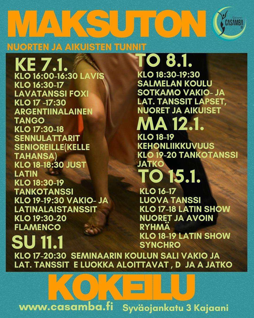 Kevätkausi alkaa 7.1. maksuttomalla kokeilu illalla. Jatkoa seuraa maksuttomilla kokeiluilla torstaina 8.1. Sotkamossa Salmelan koulun salissa sunnuntaina 11.1. Seminaarin koulun salissa Kajaanissa maanantaina 12.1. Syväojankatu 3 Kajaani torstaina 15.1. Syväojankatu 3 Kajaani Tervetuloa kokeilemaan ja harrastamaan ! #vakiojalatinalaistanssit #lavatanssit #flamenco #kehonliikkuvuus #kehonhuolto #tankotanssi #poledance #tankofitness #vakiojalatinalaistanssit #latinshow #luovatanssi #latinshowsynchro #tähtiseura #tanssiseura #dancesportfin #seuraranssiliitto #suomisport |