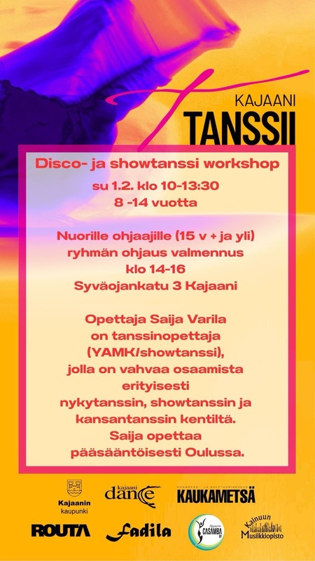 Kajaani Tanssii Festivaali disco- ja showtanssi workshop su 1.2. klo 10-13:30 8 -14 vuotta Ilmoittautuminen Suomisport https://www.suomisport.fi/events/70aa11a7-2467-4e8e-b478-ca2fb051e689 Opettaja Saija Varila on tanssinopettaja (YAMK/showtanssi), jolla on vahvaa osaamista erityisesti nykytanssin, showtanssin ja kansantanssin kentiltä. Work shop opetellaan disco- ja show tanssia. Välissä pidetään lyhyitä taukoja, jolloin voi nauttia omia eväitä. Ohjaaja valmennuksessa käydään läpi liikemateriaalin pilkkomisesta eri lajien perusteiden näkökulmasta, jota voi lastentanssissa hyödyntää, sekä lyhyesti syventää tietyille ikäryhmille suositeltuja harjoittelualueita. Hinnat Suomisport palvelussa ovat valittavana verkkopankkimaksu, korttimaksu Visa, Visa Electron ja MasterCard, MobilePay, Pivo, Siirto, Svea Erämaksu ja Svea lasku (+5 €) Tervetuloa harrastamaan ! |