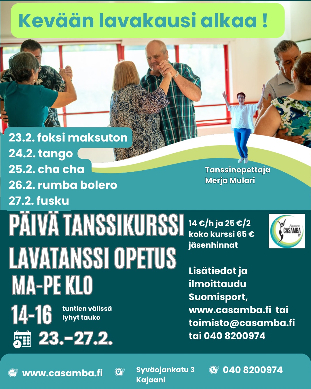 Kyllä nyt on se aika ! Tanssinopettaja Merja Mulari Tuntien välissä lyhyt tauko 23.2. Foxi maksuton 24.2. Tango 25.2. Cha cha 26.2. Rumba bolero 27.2. Fusku Tuntien tavoitteena on saada haltuun lajin omainen liikkuminen, perusaskelikko ja oikea ja vasen käännös. Näillä taidoilla voi jo aivan hyvin lähteä lavoille kokeilemaan tanssimista. Lisätietoja voit kysyä joko toimisto@casamba.fi tai Merja Mulari puh. 040 8200974 Hinnat ovat sitä halvemmat mitä enemmän tunteja valitset. Huokeimmat hinnat ovat seuran jäsenille (jäsenmaksu 20 €/vuosi) Foxi kurssi ma 23.2. maksuton Tunti hinnat jäsenille 14 €/h 2 h 25 € (tuntihinta 12,5 €) 4 h 35 € (tuntihinta 8,75 €) 6 h 50 € (tuntihinta 8,33 €) 8 h 65 € (tuntihinta 8,12 €) Foxi kurssi ma 23.2. maksuton Ei jäsen hinnat, 18 €/h 2 h 35 € {17,50 €/h) 4 h 70 € (17,50 €/h) 6 h 105 € (17,50 €/h) 8 h 136 € (17 €/h) Ilmoittautumiset Suomisport https://www.suomisport.fi/events/eebf79fe-e4cc-4ea9-beaf-9eb63db1b6c6 Lisätietoja toimisto@casamba.fi tai puh. 040 8200974) Kurssimaksut julkaistaan Suomisport palvelussa, jossa maksun voi myös suorittaa. Kurssimaksut ja jäsenmaksu veloitetaan ilmoittautumisten mukaan. Mikäli maksat kausimaksusi liikuntaetukorteilla tai niiden sovelluksella, kirjoita ilmoittautuessasi lisätietoihin millä liikuntaetusovelluksella maksat esim. E-passi . Suomisport palvelussa ovat valittavana verkkopankkimaksu, korttimaksu Visa, Visa Electron ja MasterCard, MobilePay, Pivo, Siirto, Svea Erämaksu ja Svea lasku (+5 €) Liikuntaetukorteilla tai niiden mobiili sovelluksilla maksaessa sovelluksessa - casambasalit Toimistolla maksaessa käy myös p-k ja käteinen. Tervetuloa tanssimaan ! Varusteina tunneille vaatteet, joissa on helppo liikkua. Sileäpohjaiset kengät tms. jalkineet joissa voit liikkua sisätiloissa. Kengissä olisi hyvä olla luistoa. Myös ohut nilkkasukka kengän kärkeen ulkopuolelle laitettuna antaa luistoa. Ulkojalkineet eivät ole sopivat. Juomapullo ja pieni pyyhe tarvittaessa. |